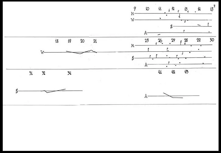 Percussion instruments are divided into four groups: metal (M), wood (W), skin (S) and all others (A) (e.g. electronic devices, radios, whistles etc.). The choice of instruments and sounds within these specifications is determined by the performer, but is intended to include an “exhausted rather than conventional” variety of playing techniques, beaters, and effects – acoustic and otherwise. The vertical position of the notes indicates volume rather than pitch, the centerline representing a dynamic of mf. Rhythm is notated spatially where a page equals one minute and one inch equals one second. As a result of this scale, where there are extended silences, much of some pages are entirely blank. score excerpt