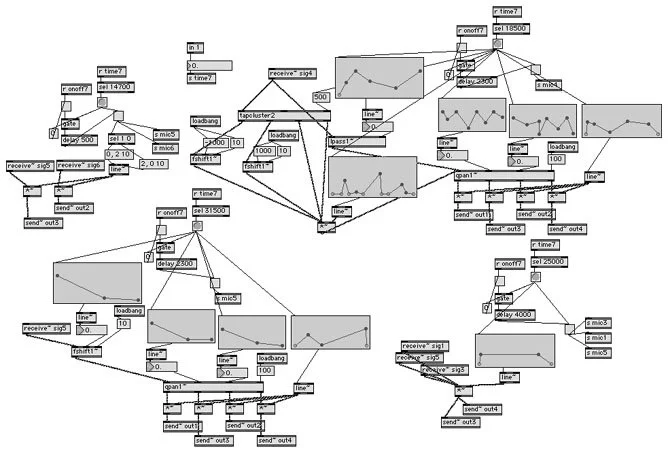 Below are two excerpts from the piece, one from the score (minute seven) and one from the schematics for the electronics in minute seven. The score excerpt exhibits many of the types of notation found in the rest of the piece (points, lines, mixtures of points and lines, silences, etc.). The electronics map is only one of a few dozen such maps.